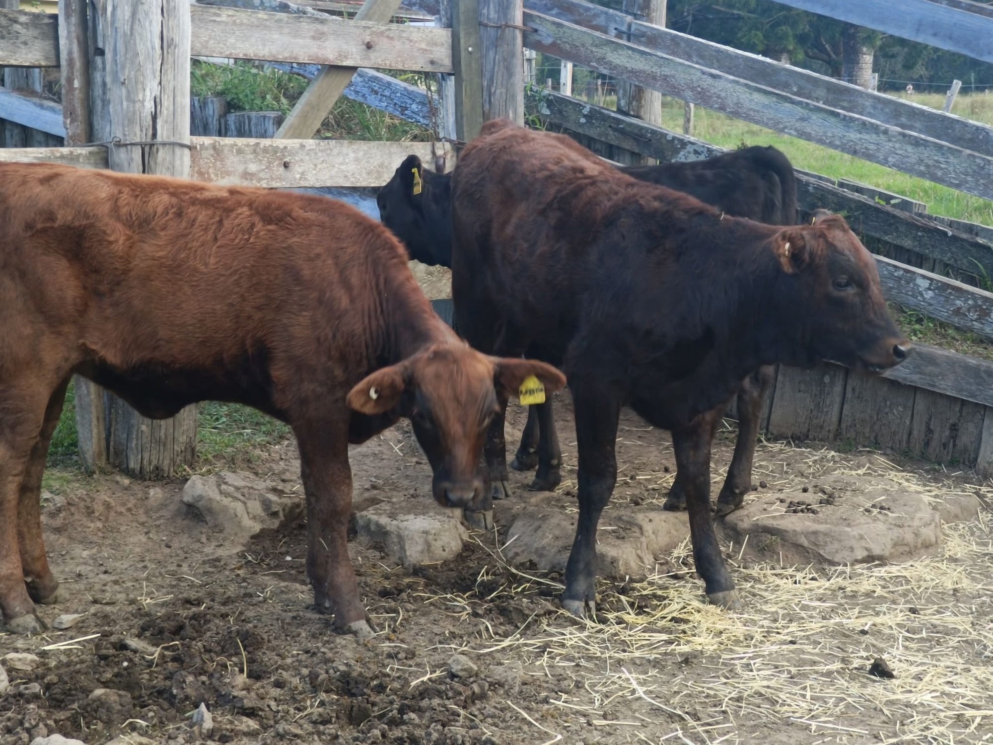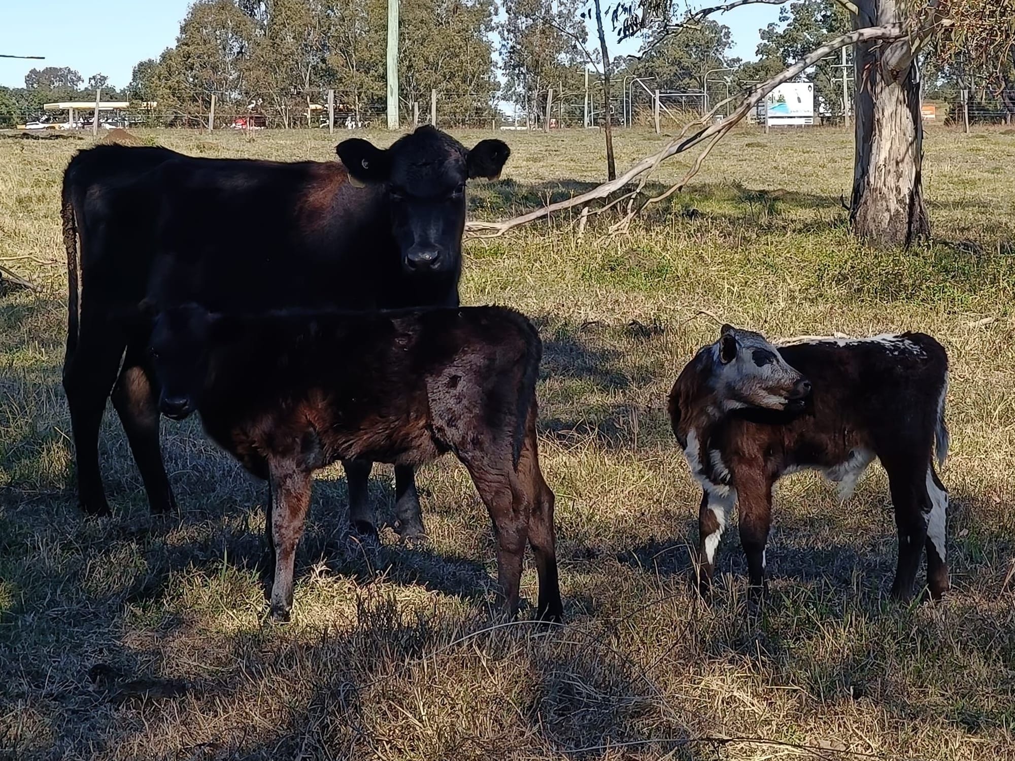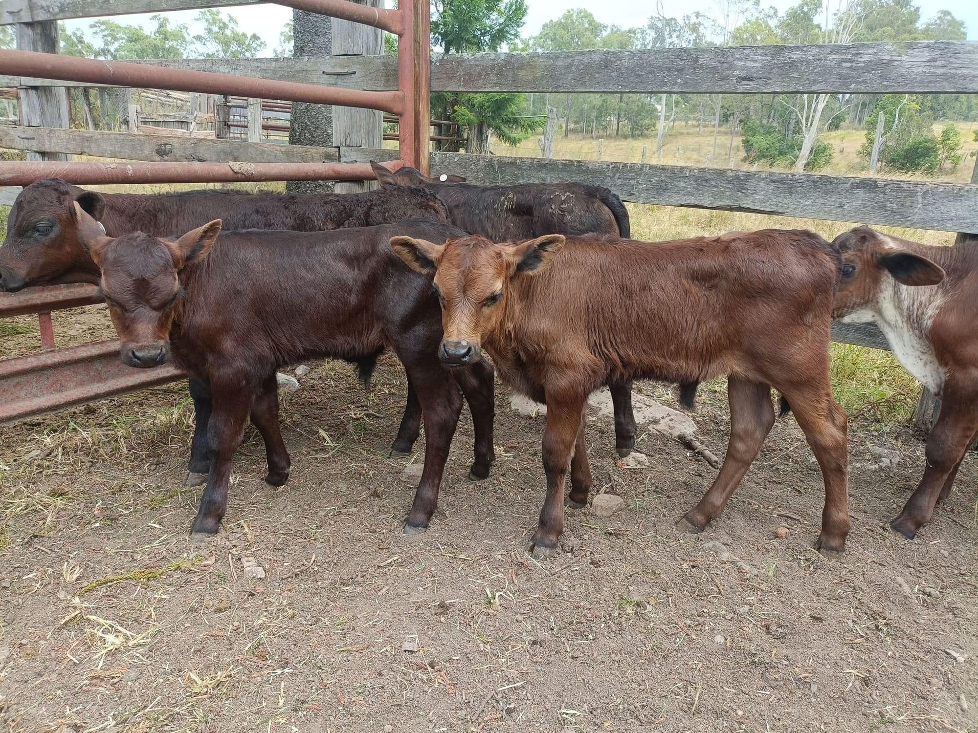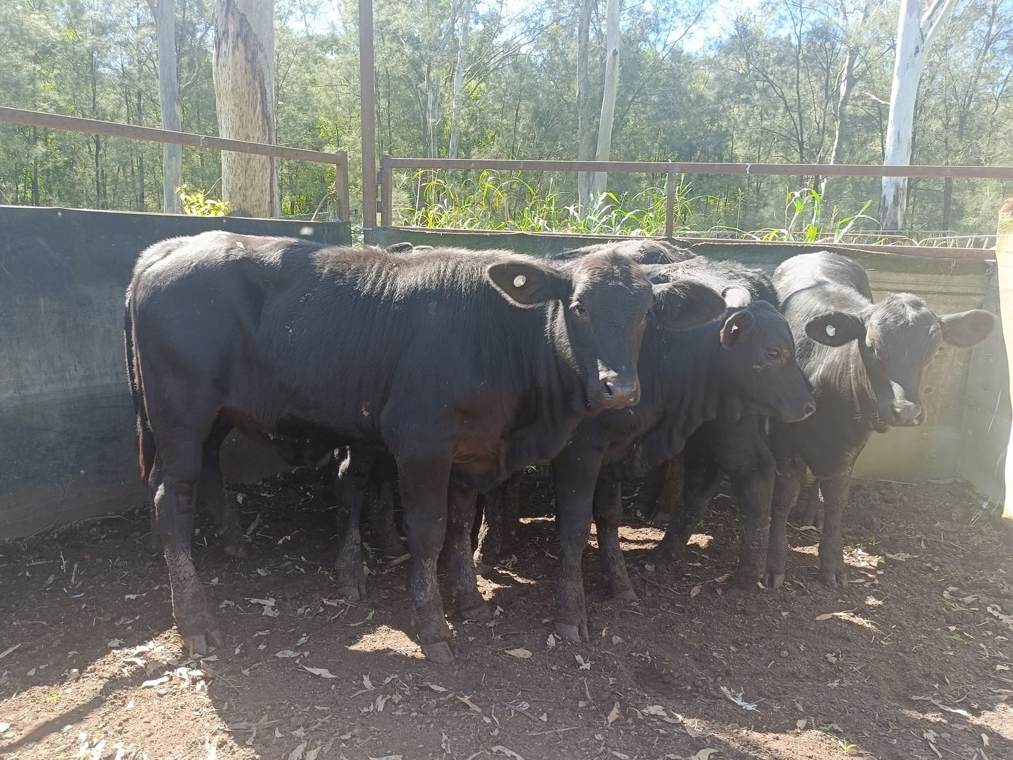 6 Brangus Angus male calves, straight beef, good quality calves, couple of bit older ones in there that are eating a heap of grain and hay and getting milk powder put in the feed as well as drinking from bucket and foster cow, selling as a group $198 each including GST can organise cheap transport if required or location is Jimboo